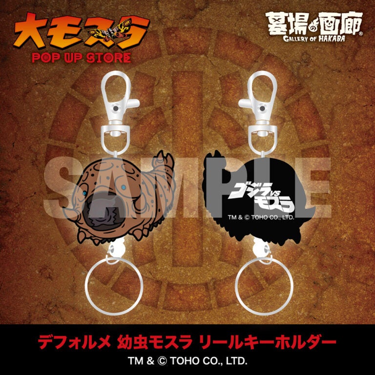 幼虫モスラの愛らしさを前面に押し出したリールキーホルダーが登場!幼虫モスラが吐く糸のように、伸縮自在のリール状リングが特徴的なキーホルダーは、かわいさと機能性を両立した逸品!誰もが喜ぶお土産に最適なアイテだ!