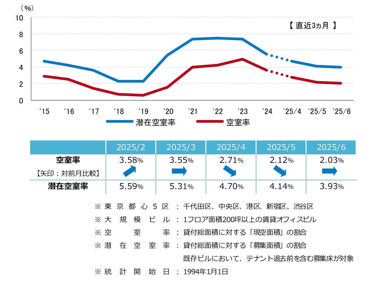 三幸エステート株式会社(本社:東京都中央区、取締役社長:福島正二郎)は、2025年6月度の東京都心5区(千代田区、中央区、港区、新宿区、渋谷区)および全国6大都市(東京、札幌、仙台、名古屋、大阪、福岡)の大規模ビル※1のマーケットデータをまとめた「オフィスマーケット2025年7月号」を公表します。