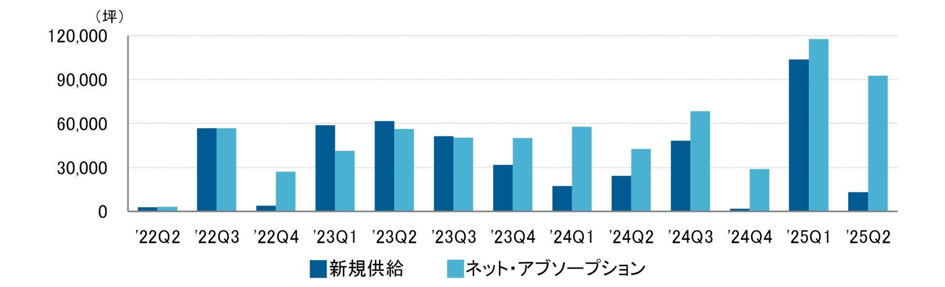 ネット・アブソープション(吸収需要)はオフィス需要の指標であり、一定期間におけるテナント入居面積(稼働面積)の増減を表す。直近2025年第2四半期の吸収需要は約9万坪の高水準となり、新規供給を大幅に上回った。需要が供給を上回る需要超過は、2023年第4四半期から7期連続となっている。オフィス需要は引き続き力強い状態にある。