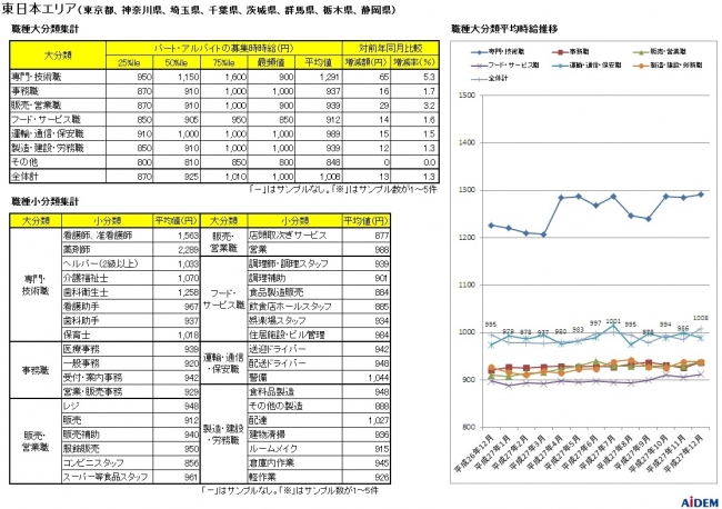 - 東日本エリア全体の平均時給は、前年同月比13円増の1,008円