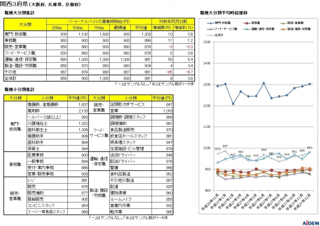 - 関西3府県全体の平均時給は、前年同月比8円増の981円
