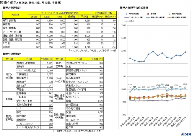 職種大分類別の平均時給は、「専門・技術職」1,291円(前年同月比48円増)、「運輸・通信・保安職」1,006円(同26円増)、「製造・建設・労務職」955円(同11円増)、「販売・営業職」948円(同24円増)、「事務職」946円(同13円増)、「フード・サービス職」929円(同15円増)の順で、前年同月比ですべての職種がプラスとなった。なお、「フード・サービス職」の前年同月比は36ヶ月連続でプラスとなっている。都県別の平均時給は、東京都1,079円(前年同月比30円増)、神奈川県1,056円(同6円減)、千葉県989円(同1円減)、埼玉県966円(同5円増)の順で、前年同月比でプラスが2都県、マイナスが2県となった。