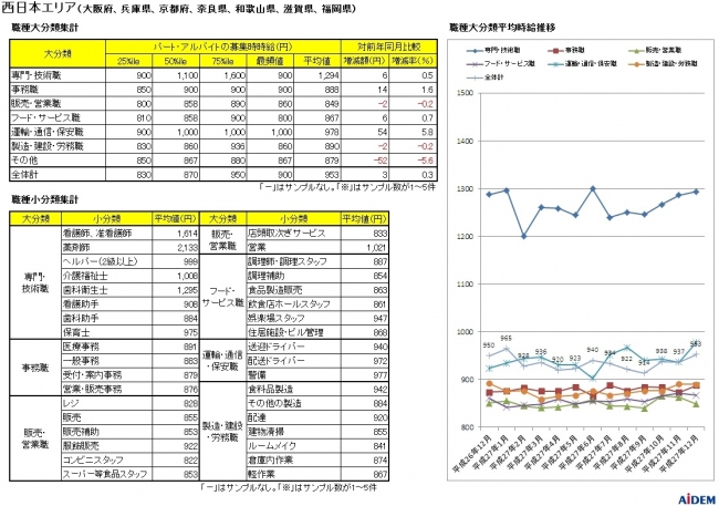 - 西日本エリア全体の平均時給は、前年同月比3円増の953円