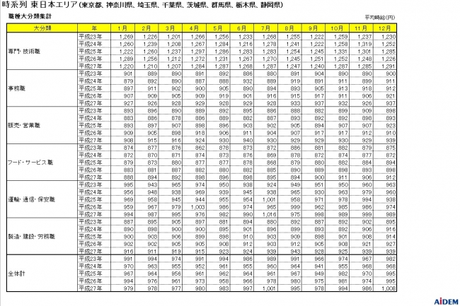 総合人材情報サービスの株式会社アイデム(本社:東京都新宿区 代表取締役社長:椛山 亮)は、当社発行の新聞折込求人紙『しごと情報アイデム』紙面より、平成27年12月のパートタイマー募集時平均時給を集計いたしました。