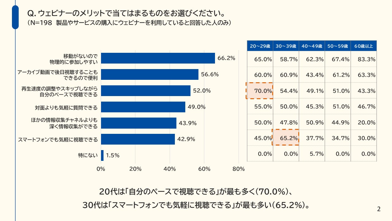 視聴者のウェビナーに参加するメリットは、回答者全体だと「移動がない」が66.2%と最多でした。ただし、年代別で見ると、20代は「再生速度の調整やスキップをしながら自分のペースで視聴できる」が70.0%。30代は「スマートフォンで気軽に視聴できる」が65.2%と全体との回答傾向が異なりました。