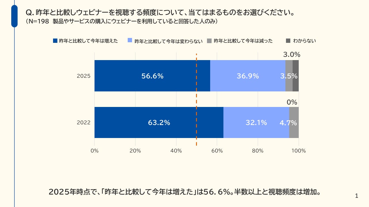 ■視聴者の約6割が「2024年と比較して2025年はウェビナーの視聴頻度が増えた」と回答し、2022年調査時と同様に増加傾向を維持