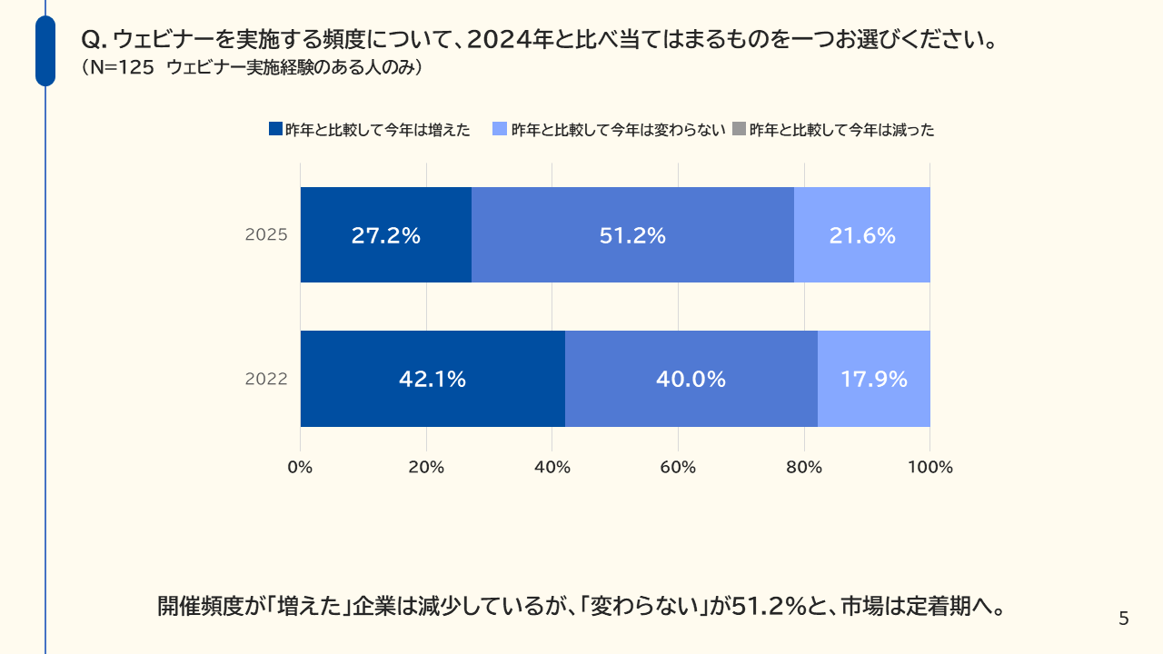 企業のウェビナー開催頻度は、2024年と比較して2025年は「増えた」が約3割、「変わらない」が5割と、実施頻度は横ばいで推移