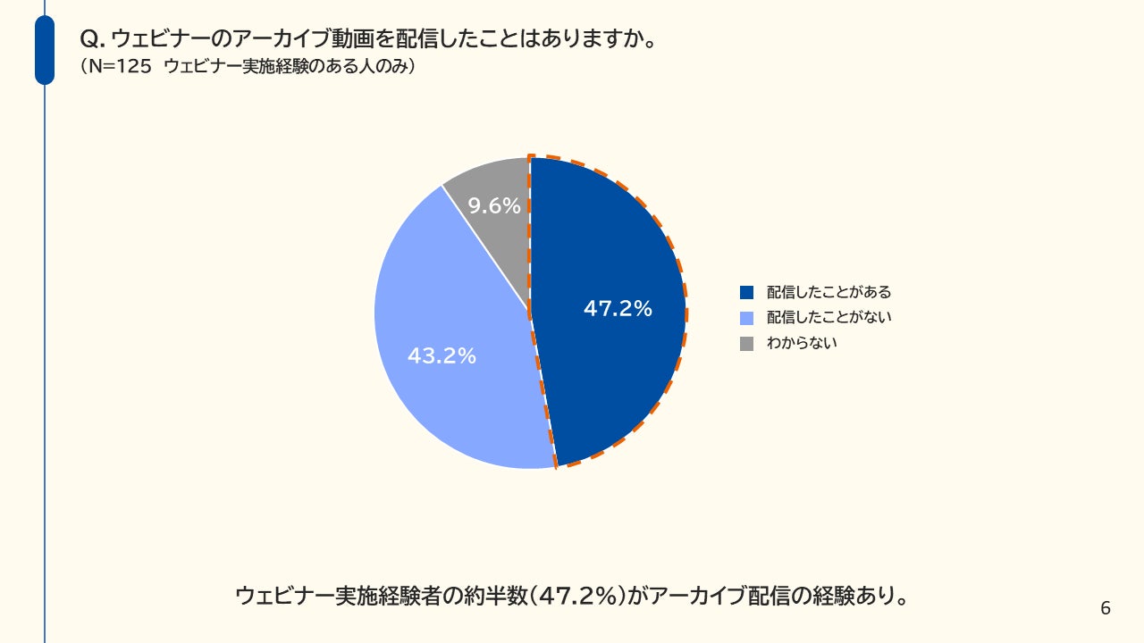 ウェビナー開催企業でアーカイブ配信をした経験があるのは、47.2%に留まります。これは、約9割の視聴者がアーカイブ視聴経験を持つという需要とは対照的な結果となりました。