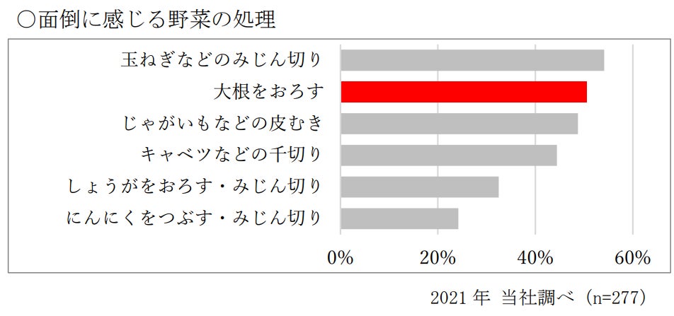 大根おろしは薬味や料理の材料として使用用途が幅広い一方で、大根をおろすのに時間がかかる、日持ちせず作り置きが出来ない、余らせてしまう等、手軽さへのニーズが潜在しています。