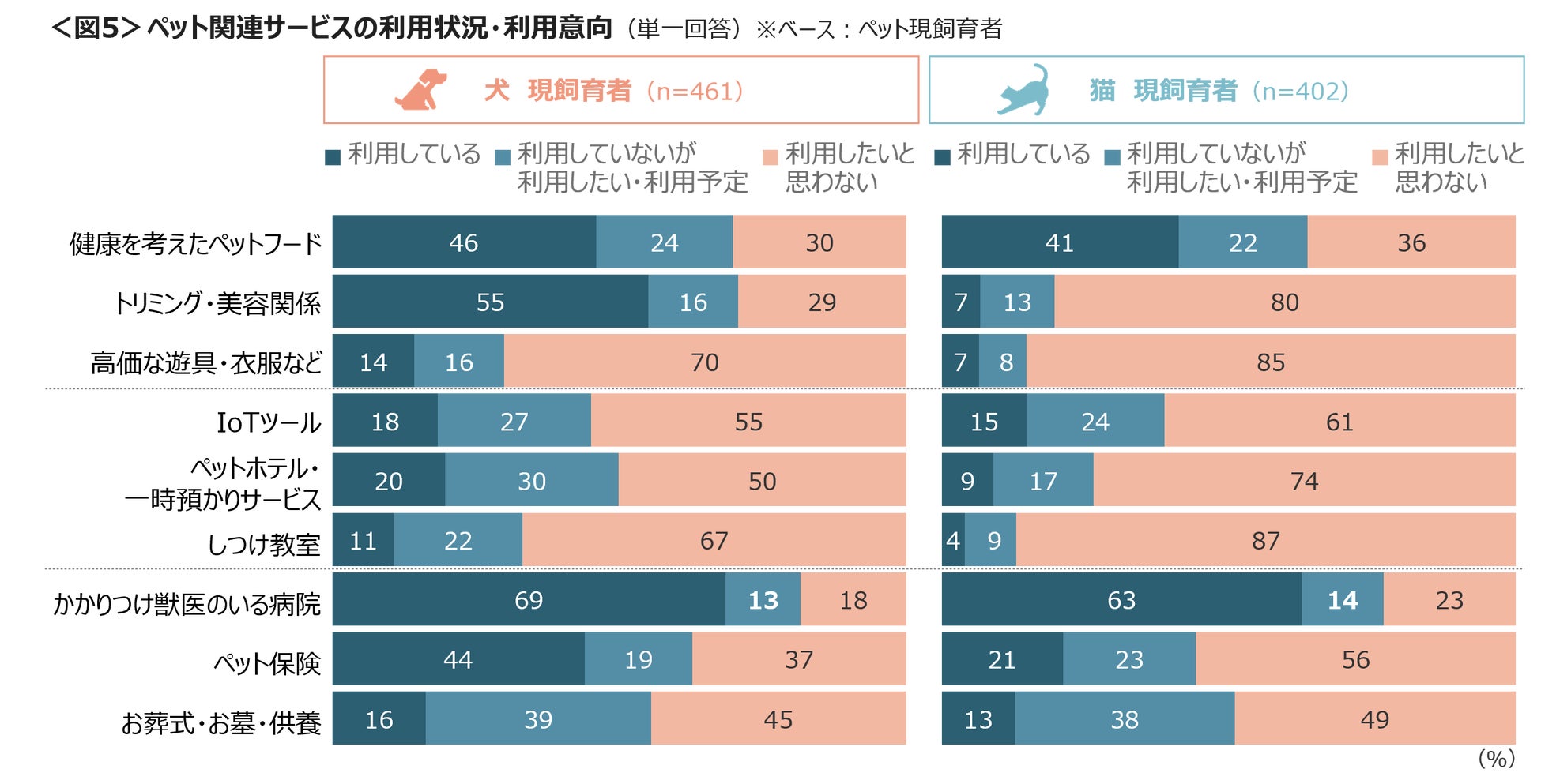犬の現飼育者で利用しているサービスは、「かかりつけ獣医のいる病院」69%、「トリミング・美容関係」55%、「健康を考えたペットフード」46%、「ペット保険」44%。猫では「かかりつけ獣医のいる病院」63%、「健康を考えたペットフード」41%が高い。利用していないが利用したい・使用予定では、犬、猫現飼育者の4割近くが「お葬式・お墓・供養」をあげていた。<図5>