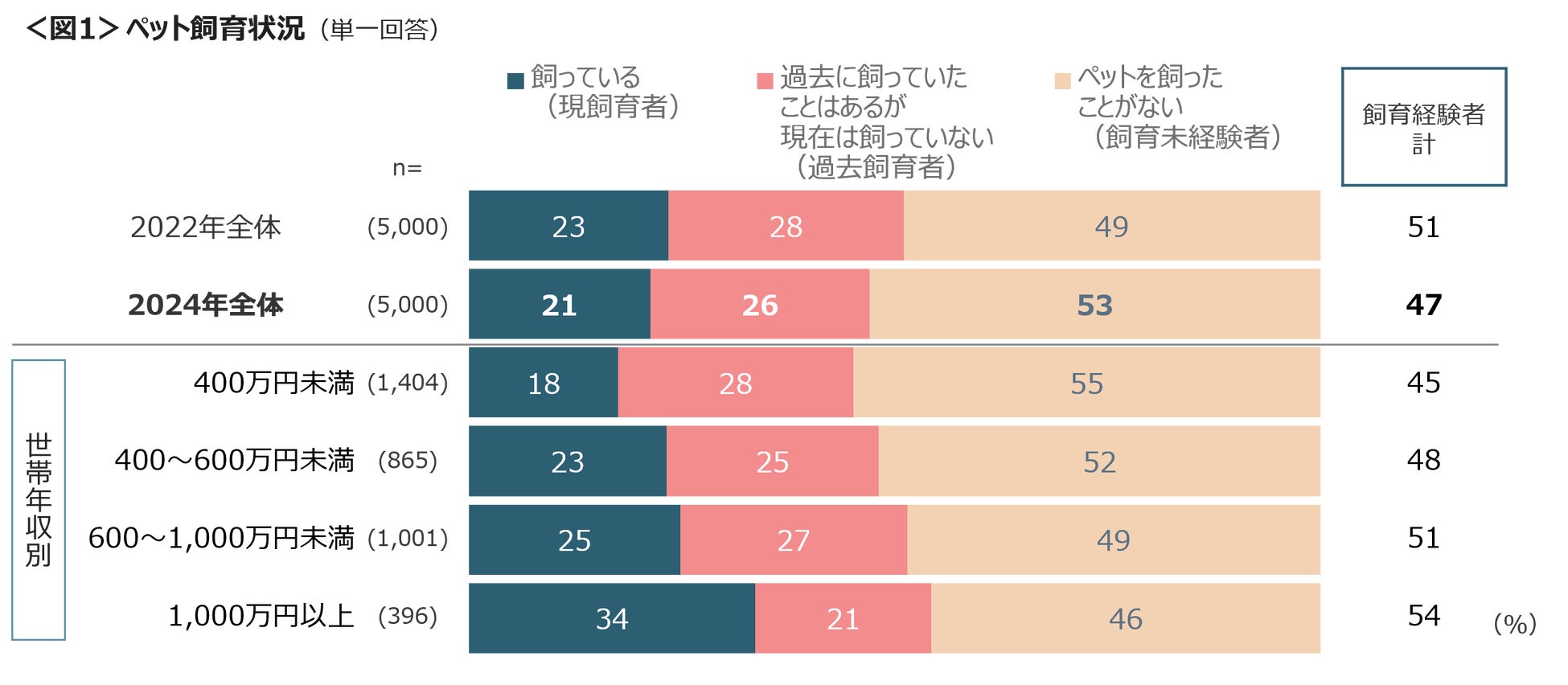 現在、ペットを飼育している人(現飼育者)は21%、過去に飼育していたが現在は飼育をやめた人(過去飼育者)は26%と、合わせて47%はペットの飼育経験がある。コロナ禍の2022年と比べると飼育率は若干低下している。世帯年収が高くなるほどペットを飼っている人が増える傾向にあり、年収1,000万円以上では現飼育者で34%を占める。<図1>