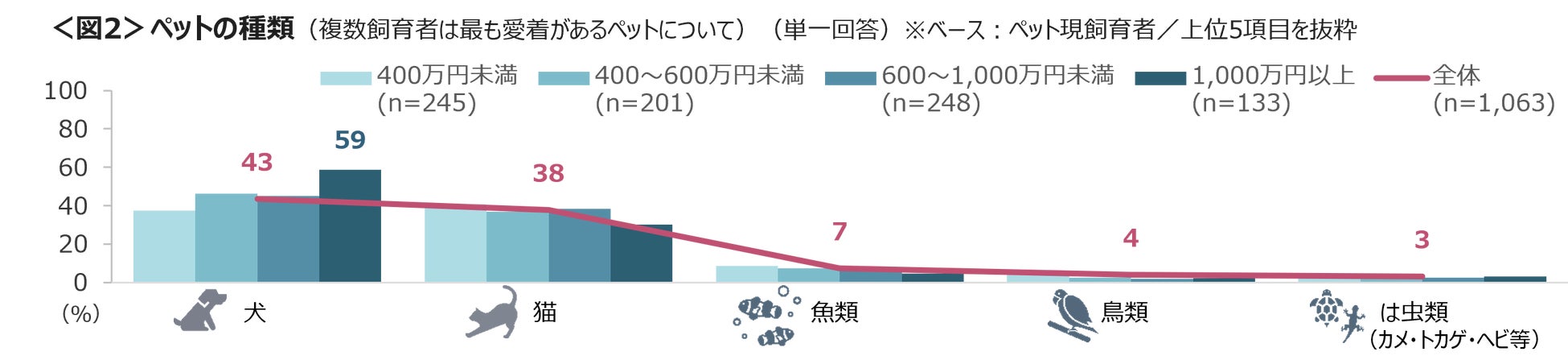 飼っているペットの種別は、「犬」が43%、「猫」が38%と2強。世帯年収が1,000万円以上の世帯では「犬」を飼っている割合は59%に達する。<図2>