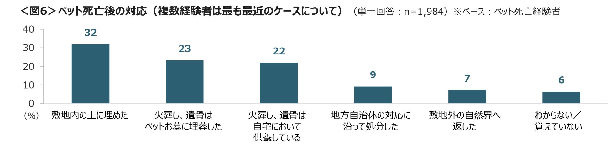 過去に飼っていたペットが死亡した場合、亡骸をどのようにしていたかを聴取した結果、「敷地内の土に埋めた」32%、「火葬し、遺骨はペットお墓に埋葬した」23%、「火葬し、遺骨は自宅において供養している」が22%と多く、火葬をしているケースは45%みられた。<図6>
