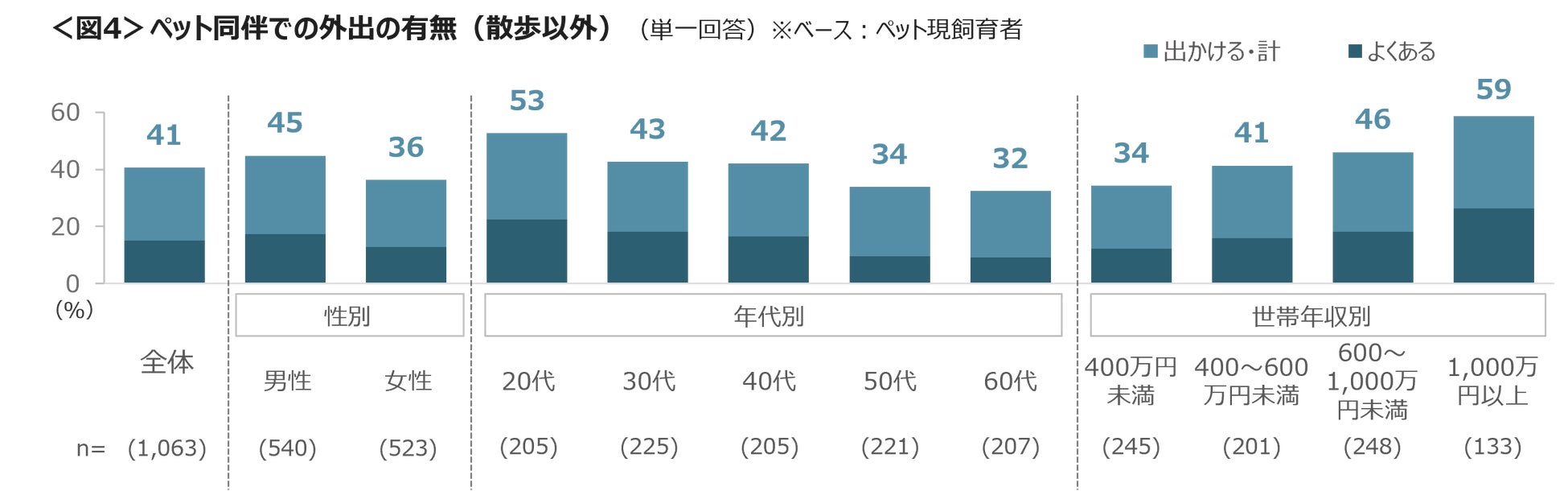 散歩以外でペットと一緒に外出する割合は41%。20代や年収1,000万円以上の世帯では、ペットと一緒に出かける人が5割台と多く見られた。<図4>