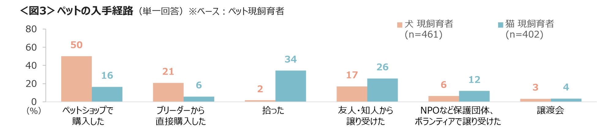 犬の入手経路は「ペットショップで購入」が50%と半数、「ブリーダーから直接購入」21%、「友人・知人から譲り受けた」17%と続く。一方猫の場合「拾った」34%、「友人・知人から譲り受けた」26%、「ペットショップで購入」16%であり、「拾った」ケースが特に目立つ。<図3>
