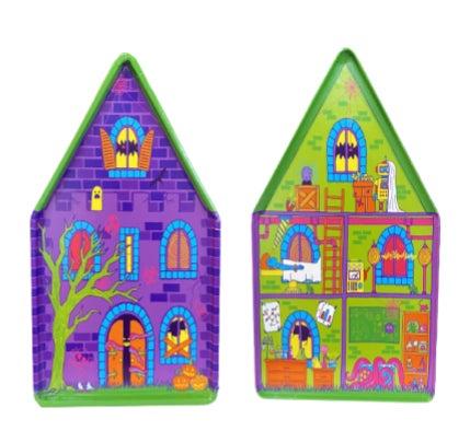 バスボムなど6~7個のアイテムを詰めることができるギフト缶。表側のデザインはフランケンシュタインの家や実験室を、裏側は実験室の中の様子をイメージ。