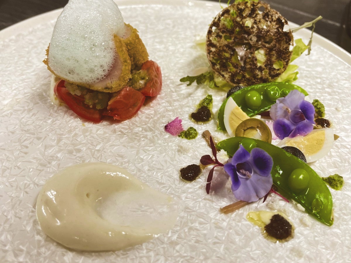 2025年5月30日に第1回目「ニース・プロヴァンスへの旅」が開催されました。見た目も美しい前菜から始まり、ニース風サラダや金目鯛のブイヤベース、釜グランデで仕上げる牛肉の土鍋煮込みなど伝統的なお料理と共にニースの青い海(波)をイメージしたワインなど、各種ペアリングもお愉しみいただきました。
