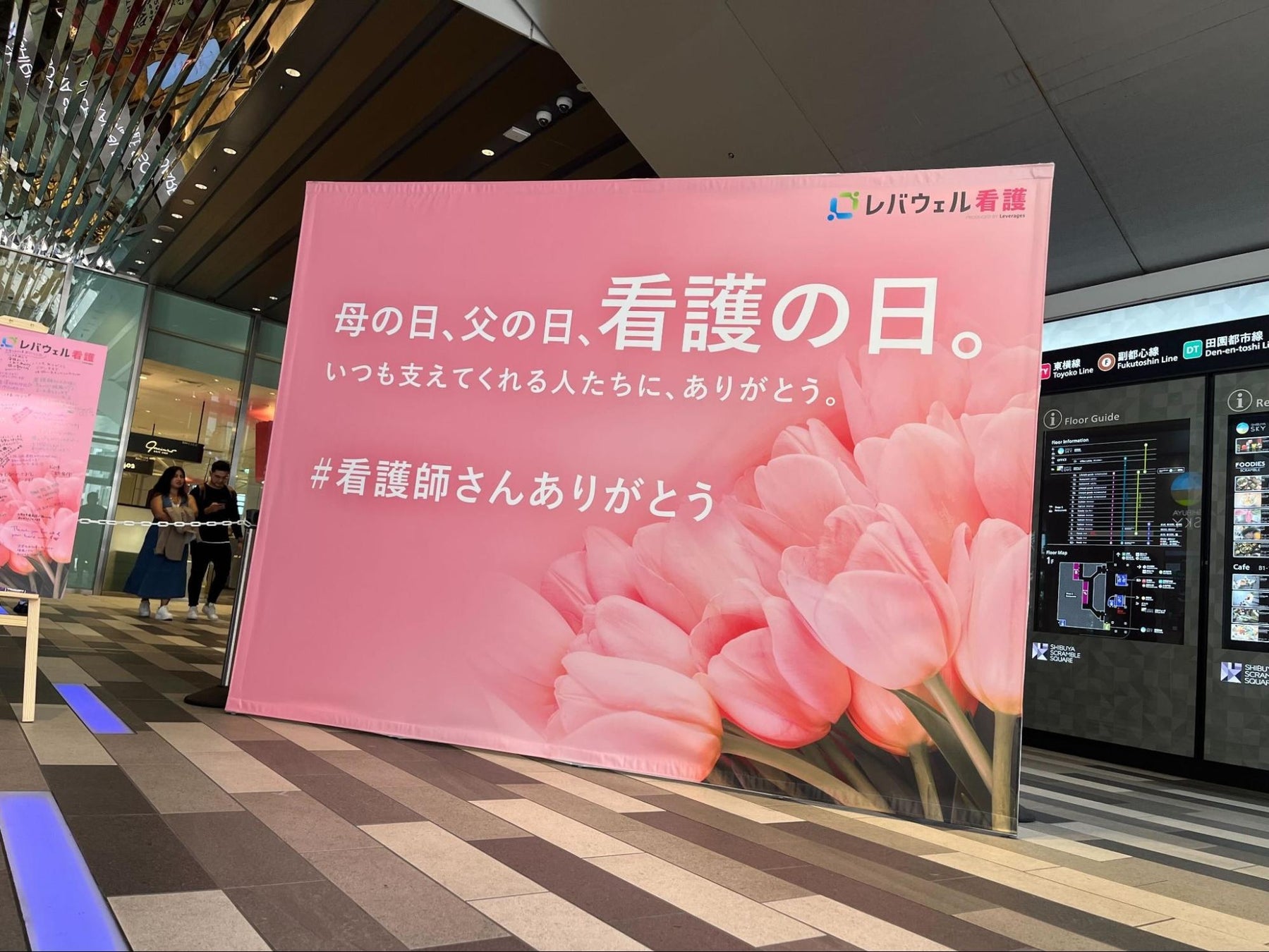5/12「看護の日」当日、イベント会場である渋谷スクランブルスクエア1階アーバン・コア スペースは、学生やビジネスパーソン、主婦の方々や外国人観光客など、様々な方たちが行き交っていました。会場には『母の日、父の日、看護の日。いつも支えてくれる人たちに、ありがとう。』と書かれた巨大なピンク色の看板が置かれ、足を止める方も多く、通行人の方々の興味を惹くイベント会場となりました。