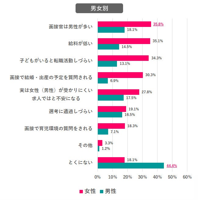 男女別に見てみると、男性は「とくにない」と回答した人が最も多く44.4%で、女性の18.1%と大きな差がある結果となりました。「男性であること」が転職活動に影響を与えることは少ないようです。