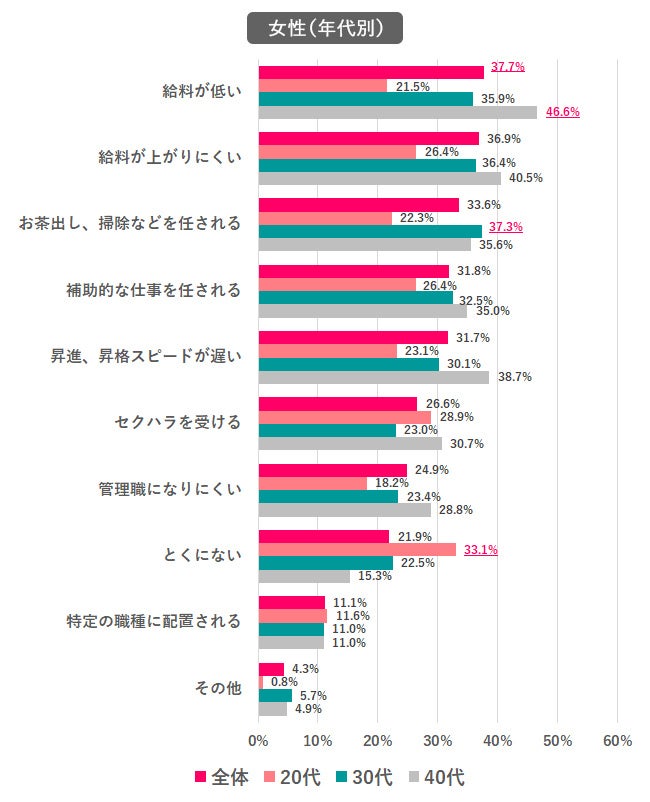 年代別で見てみると、20代の1位は「とくにない」33.1%、30代は「お茶出し、掃除などを任される」37.3%、40代は「給料が低い」46.6%でした。Q.1の結果とあわせてみても、20代のうちはジェンダーギャップを感じる機会が少なく、既婚者が増える30代以降はより顕著にジェンダーギャップを感じるようになることがわかります。