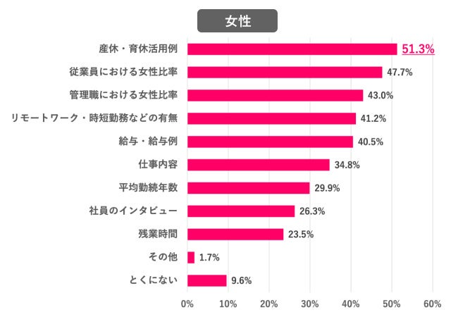 ジェンダーギャップのない企業かどうか見極めるために求人情報の中で注目する項目としては、1位「産休・育休活用例」51.3%、2位「従業員における女性比率」47.7%、3位「管理職における女性比率」43.0%と続きました。ライフスタイルの変化に対応できる職場か、実際に女性が重要ポジションに登用されているかどうかをデータで確認する人が多く見受けられました。