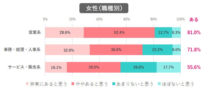 主な職種別で見てみると、ジェンダーギャップを感じている職種は「営業系」で81.0%でした。次いで「事務・経理・人事系」71.8%、「サービス・販売系」55.6%となっています。男性の就業比率が高い「営業系」はギャップを感じやすく、女性比率が高い「サービス・販売系」は感じにくいと言えそうです。