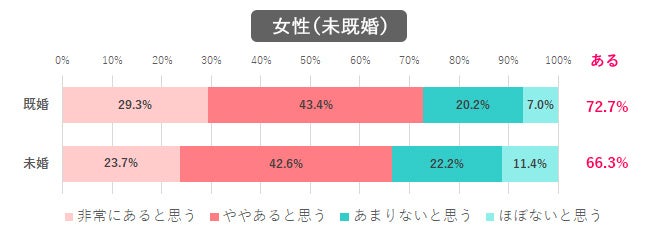 女性の未婚・既婚別で見てみると、既婚の人では72.7%の人がジェンダーギャップが「ある」と回答し、未婚の人の66.3%を上回る結果となりました。