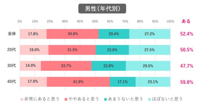 「ある」と感じている男性は女性と比較すると16.7%低く、とくに30代では女性よりも男性の方が22.7%も低い結果です。男女間で認識に大きな差があることがわかりました。