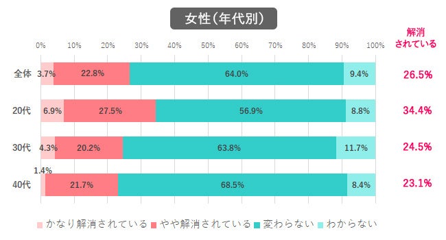 年代別では、「解消されている」と感じる人が20代34.4%、30代24.5%、40代23.1%という結果でした。年代が上の人ほど「解消されていない」と感じているようです。
