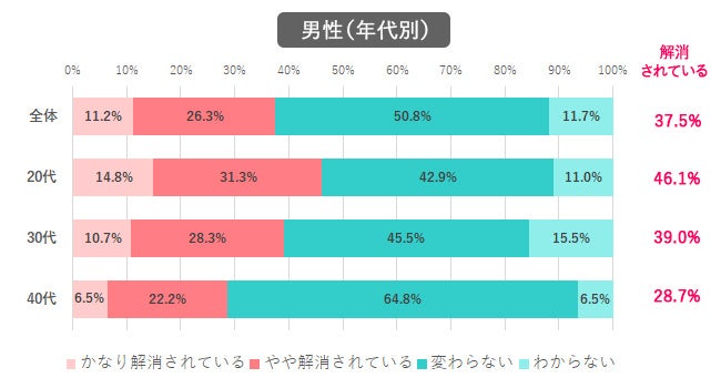 年代別では、20代46.1%、30代39.0%、40代28.7%と、女性同様に年代が上であるほど「解消されていない」と感じる人が多いようです。