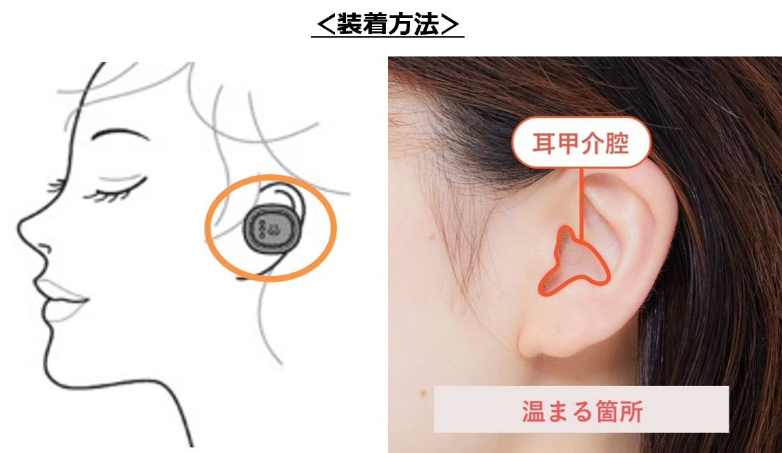 装着時には耳甲介腔へ本体が当たるように斜めから横向きになるように装着することで、よりフィット感、遮音性を高められます。