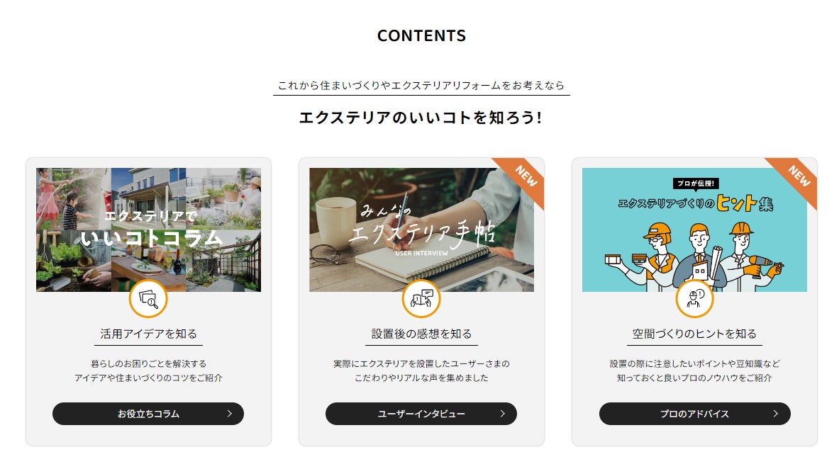 「エクステリアでいいコトコラム」、「みんなのエクステリア手帖」、「エクステリアづくりのヒント集」は、今後も追加予定です。