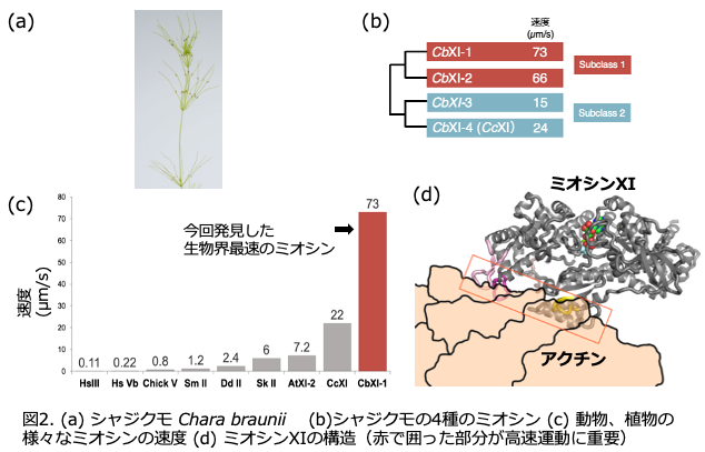 50年以上前から、数センチメートルにもおよぶ桁違いの細胞サイズと最速の原形質流動速度を持つ淡水産の藻類のシャジクモ類(Chara corallina, Chara braunii)に、被子植物のミオシンXIの10倍の速度を持つ生物界最速の超高速ミオシンが存在することが、その原形質流動速度から予想されていました。
