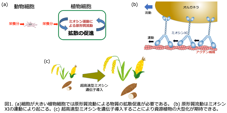 研究グループは以前、被子植物のミオシンXIをオオシャジクモ(Chara corallina)のミオシンXIの CcXI(被子植物のミオシンXIの3倍の速度をもつミオシンXI)に分子生物学的手法により置き換えた際、原形質流動速度の上昇とともに植物体の大きさが増大することを示しました(注3)。しかしながら、10倍の速度を持つ超高速ミオシンの実体は謎でした。超高速ミオシン遺伝子の単離および超高速運動を可能にする分子機構が明らかになれば、資源植物の原形質流動速度の上昇を通じて、植物体の大型化が期待できます(図1c)。