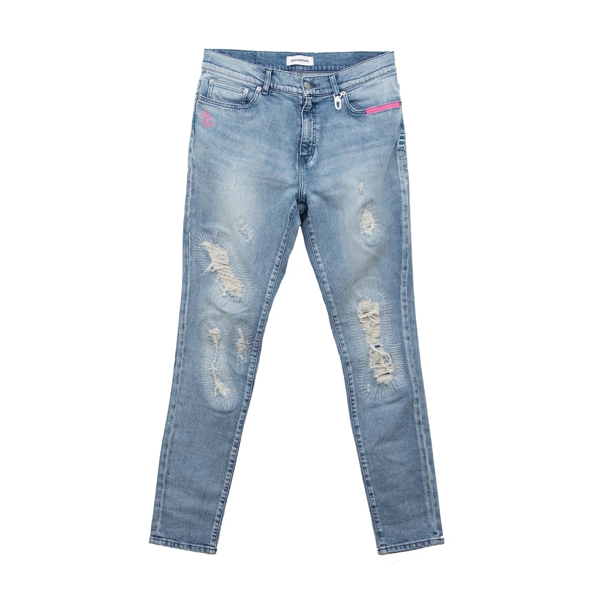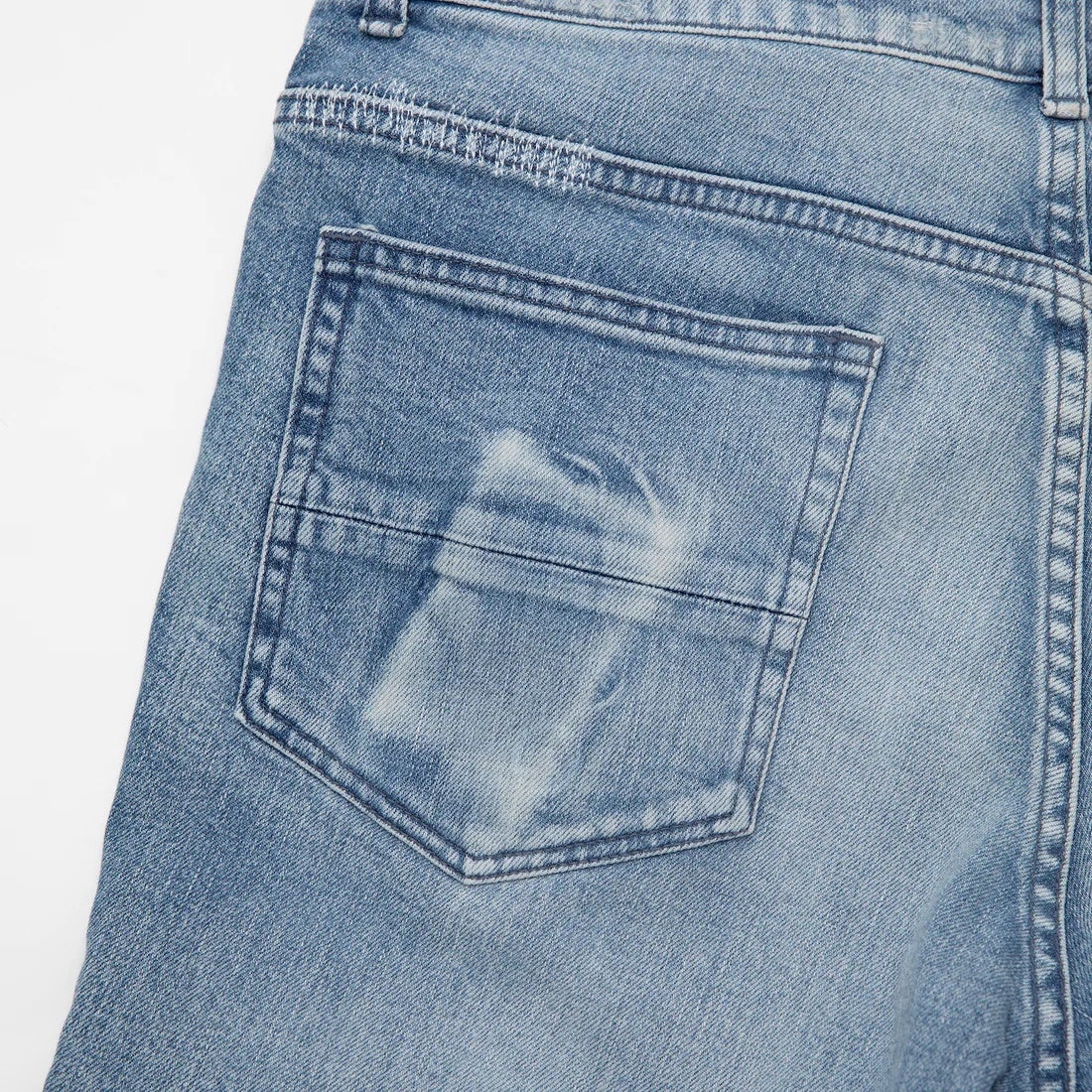 大胆なダメージ加工でエッジの効いたスタイリングを楽しめるデニムパンツ。ダメージ加工のほか、随所に施されたステッチや、ブランドロゴであるの「E」の刺繍、さらに後ろポケットにはジッポライターの痕を模したデザインが施されていたりと細部まで遊び心が組み込まれた仕上がりとなっております。