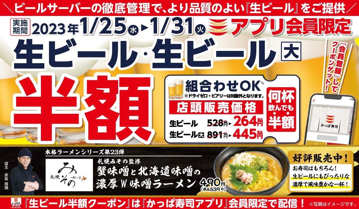 コロワイドグループのかっぱ寿司(カッパ・クリエイト㈱ 本社:神奈川県横浜市)は、2023年1月25日(水)〜 1月31日(火)の期間、かっぱ寿司で利用できる「生ビール半額クーポン」をかっぱ寿司アプリ会員に配信いたします。また本日1月18日(水)より「本格ラーメンシリーズ」第23弾、札幌みその監修『蟹味噌と北海道味噌の濃厚W味噌ラーメン』を、かっぱ寿司全店にて販売いたします。