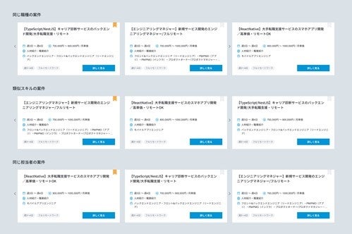 自身が興味のある案件を判断しやすくするため、案件の特徴がわかるタグを新設。また、開発環境に関わるスキルタグもIT人材視点で最適化を実施しました。その他、稼働工数や単価、業務内容などの案件概要が一目でわかる仕様に変更。さらに、自身が検索した案件に近しい案件を紹介するレコメンド機能も搭載しました。
