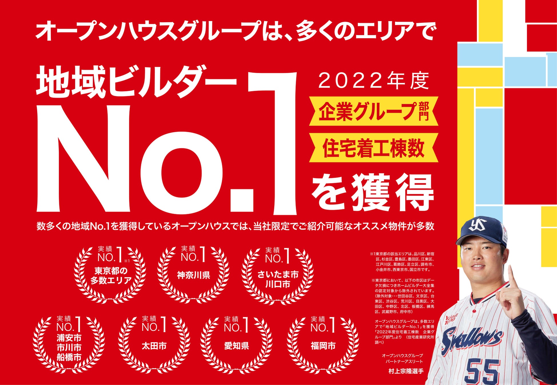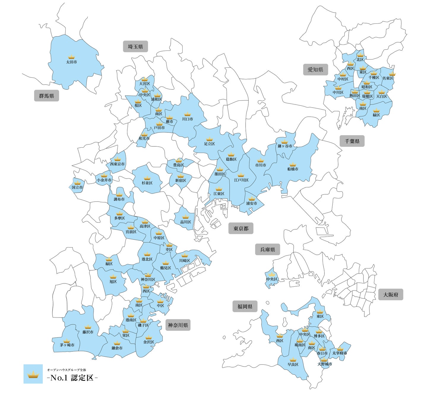 株式会社オープンハウスグループ(本社 東京都千代田区、代表取締役社長 荒井正昭、以下「当社」)は、当社グループが東京都、神奈川県、千葉県、埼玉県、群馬県、愛知県、兵庫県、福岡県の多数エリアで「地域ビルダーNo1」を獲得したことをお知らせいたします。