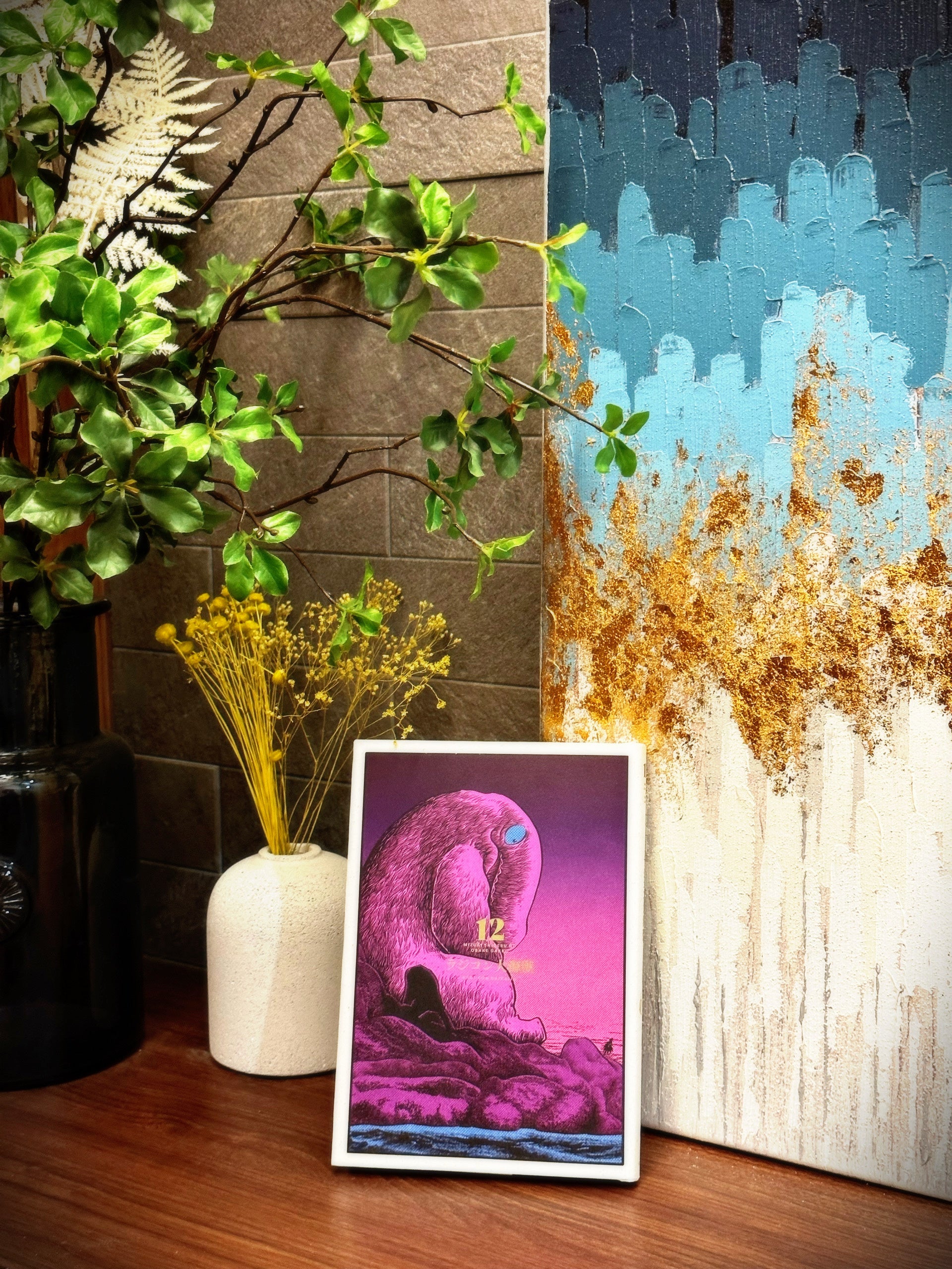 装丁はドイツ装と呼ばれる、少し変わった仕様を採用。表紙に立体感があり、ゴールドのインクが華やかです。画集ですので、写真集によく使用される発色のよい用紙に印刷予定です。色の違う用紙を組み合わせて作ったこだわりのスリーブケースに入れてお届けします。