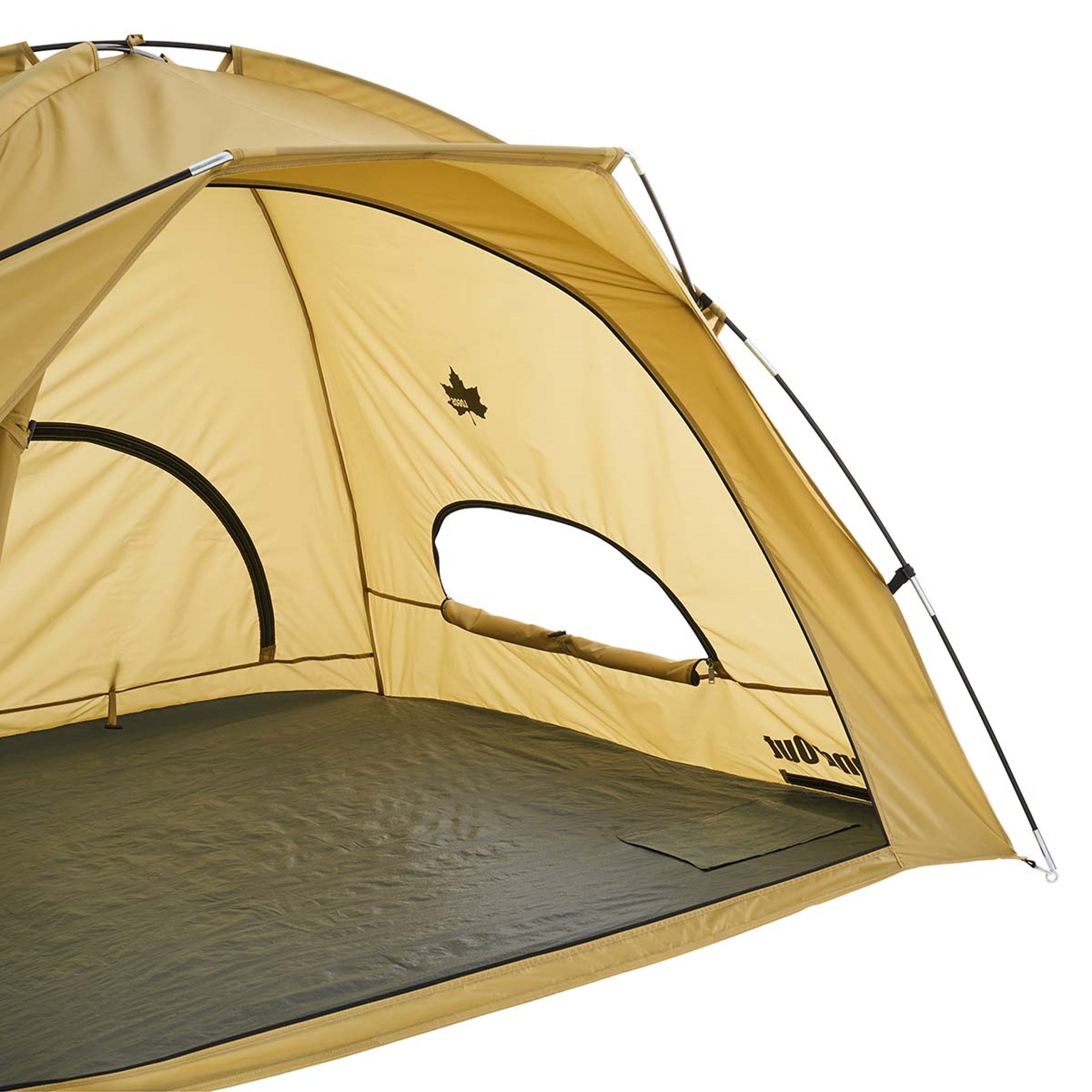 大型の窓を3ケ所設けることで、優れた通気性と開放感を実現。フライシートにはUV-CUT加工を施しているので、紫外線から室内を守ることができる。フルクローズタイプだから着替えや授乳時に便利。