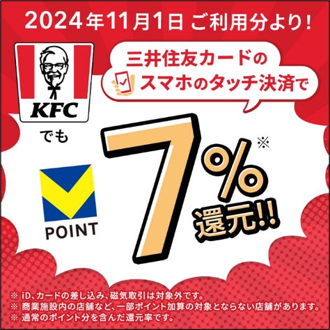 三井住友カードは、「対象のコンビニ・飲食店で最大7%還元!」にて、対象店舗でスマホのタッチ決済をすると7%還元がされるサービスを実施中ですが、この度、2024年11月1日(金)よりケンタッキーフライドチキンが対象店舗に追加となりました。ぜひ、年末前に三井住友カードを使ってお得にお買い物をお楽しみください!