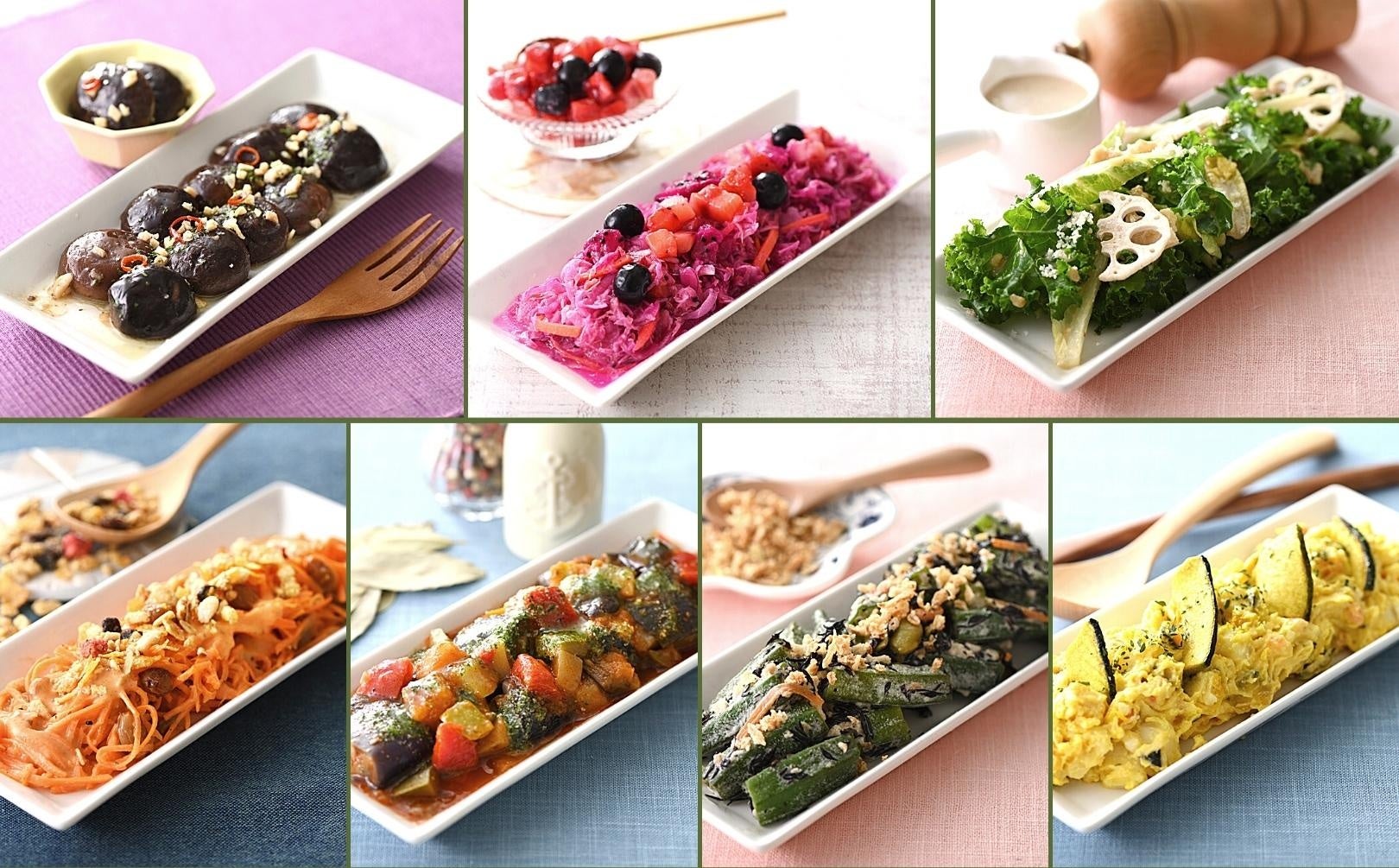 レモン風味でさっぱり!ほんのりベリーが甘酸っぱく、鮮やかなピンク色に色付いた『ドラゴンフルーツとベリーのコールスロー』や、ちょっぴりスパイシーなコブドレッシングに、ドライフルーツの甘みが合わさった『人参とドライフルーツのコブドレ仕立て』、ほんのりとニンニクの風味がきいた和風仕立てで、噛むほどにじゅわっと美味しさが広がる『丸ごと椎茸のペペロンチーノ』など、バラエティー豊かなラインナップが勢ぞろい!
