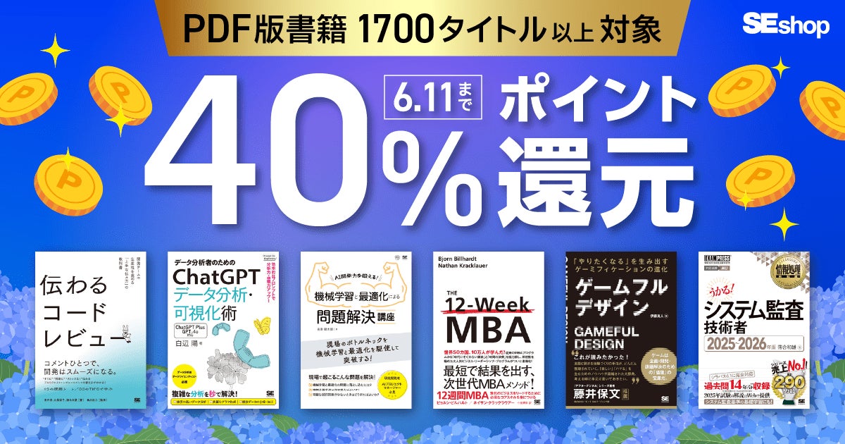 SEshopは、IT書・ビジネス書をはじめ、資格書や実⽤書まで幅広いラインナップを展開する翔泳社の公式通販サイトです。6月11日(水) まで、PDF版の対象書籍を購入すると、本体価格の40%をポイント還元するキャンペーンを開催します。貯まったポイントは1ポイント=1円として次回のお買い物から使えます。新刊含む1700点以上のタイトルが対象となります。