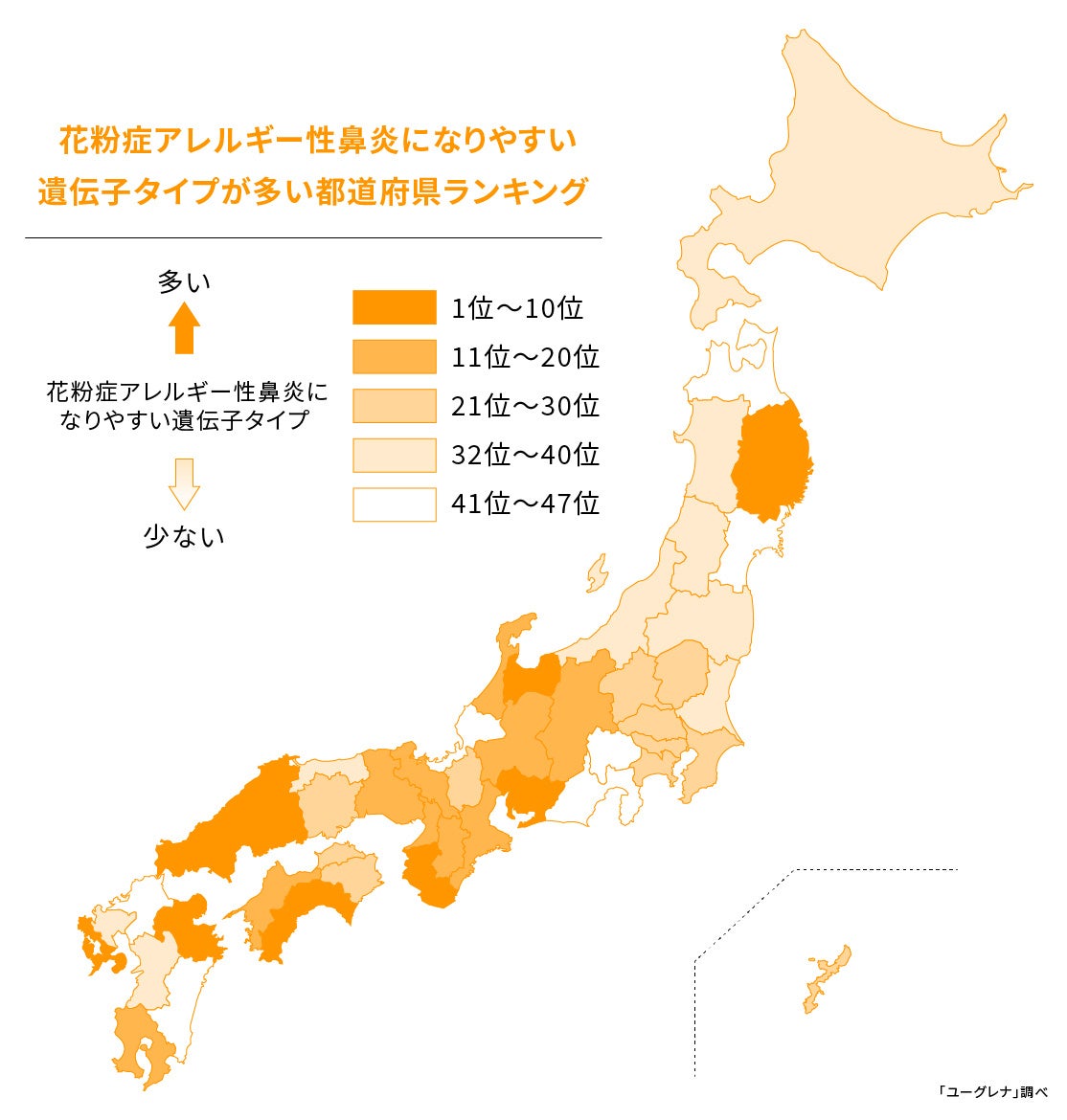 株式会社ユーグレナ(本社:東京都港区、代表取締役社長:出雲充)は、ユーグレナ・マイヘルスとジーンクエストの遺伝子解析サービスのゲノムデータをもとにした「花粉症アレルギー性鼻炎になりやすい遺伝子タイプが多い都道府県※1ランキング」を公開します。春の花粉シーズンは終了に近づいたものの、次は、シラカバやイネ科の花粉、夏から秋には草の花粉が多く飛びます。今は花粉症を発症していない方も、今後、発症を防ぐための対策にお役立てください。