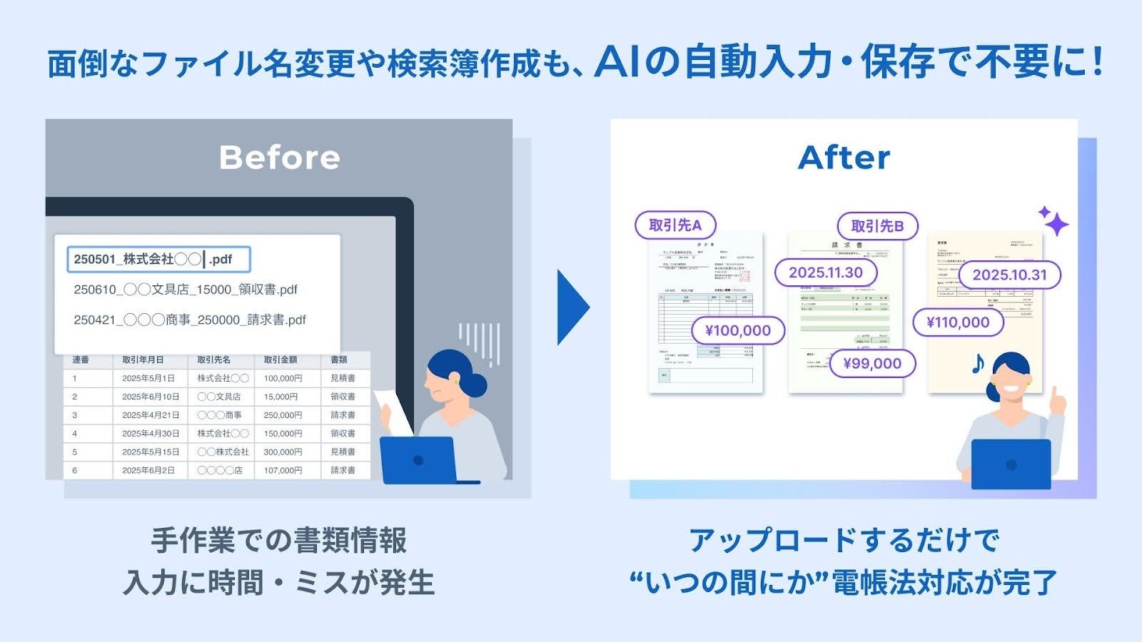 「バクラク申請」では、多様な入力項目を設定でき、AIにより入力ミスや確認作業を大幅に削減できます。また、文書管理をPC上に物理的な書類棚を再現するような「フォルダ管理」から、必要な情報へ瞬時にアクセスできる「データベース管理」へと刷新します。