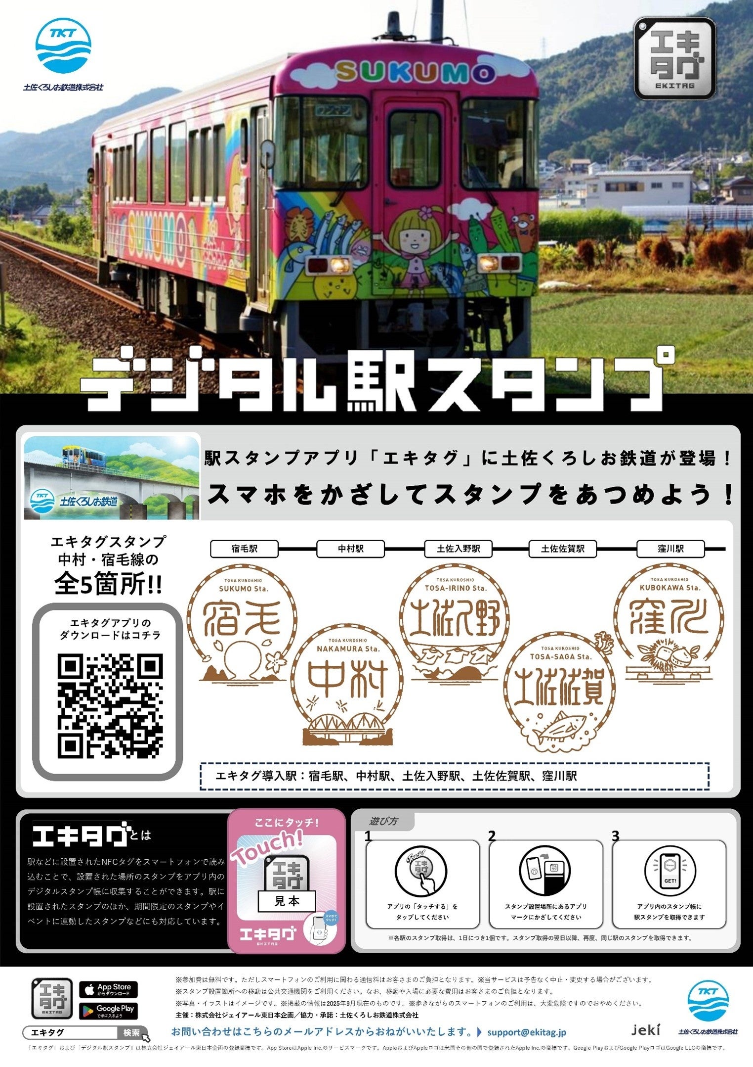 ◎株式会社ジェイアール東日本企画が提供する駅スタンプアプリ「エキタグ」では、2025年9月8日(月)より、高知県エリア 土佐くろしお鉄道の中村・宿毛線にエキタグがデビューします。