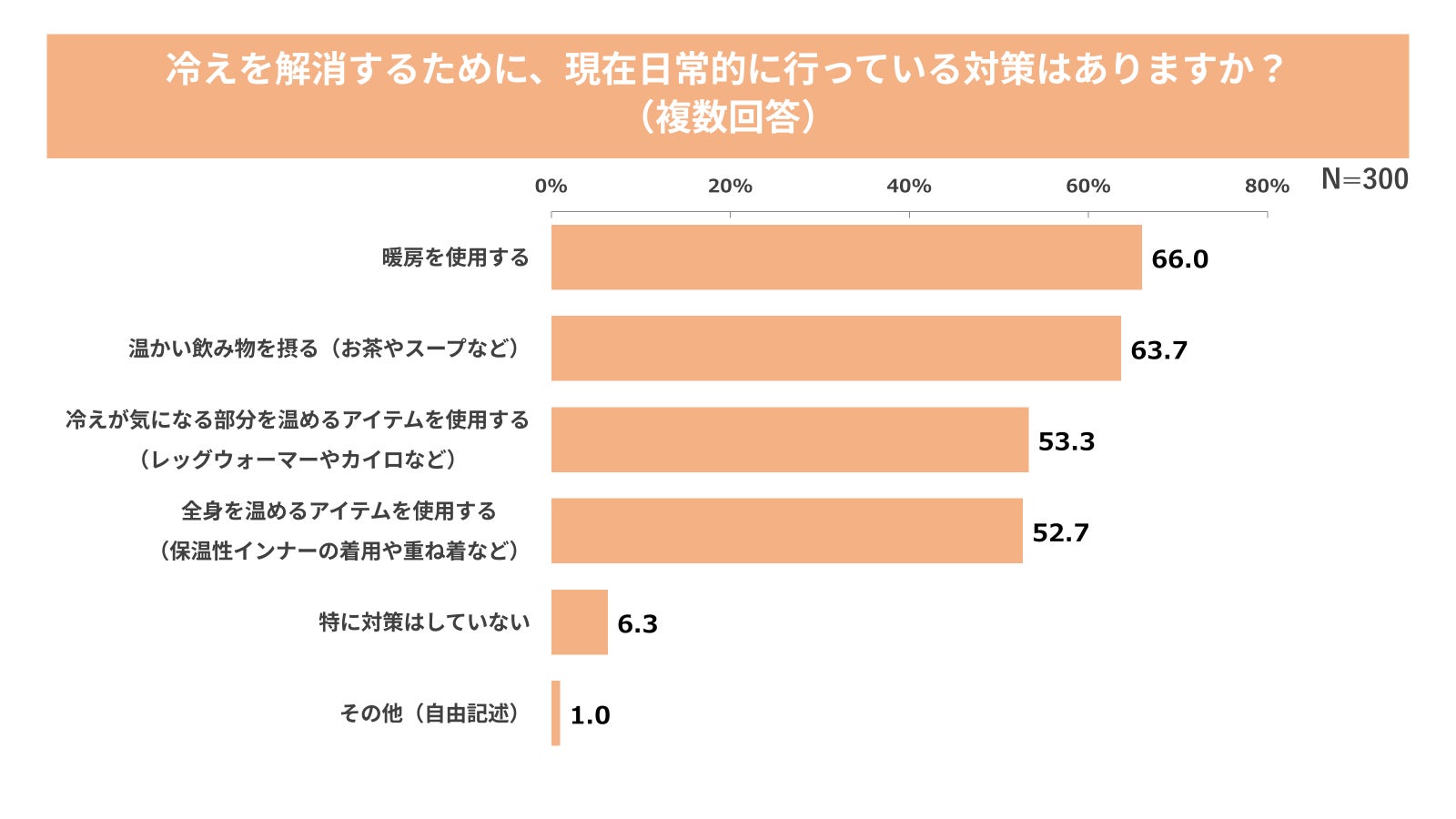 調査結果によると、9割以上の女性が日常的に冷え対策を実施しており、最も多い対策として「暖房を使用する(66.0%)」が挙げられました。その次に多かったのは、「温かい飲み物を摂る(63.7%)、「冷えが気になる部分を温めるアイテムを使用する(53.3%)」、「全身を温めるアイテムを使用する(52.7%)」という対策でした。これらの対策は、冷えを軽減するために欠かせない手段として多くの女性に取り入れられており、寒暖差の激しい季節でも快適に過ごすための重要な方法となっています。