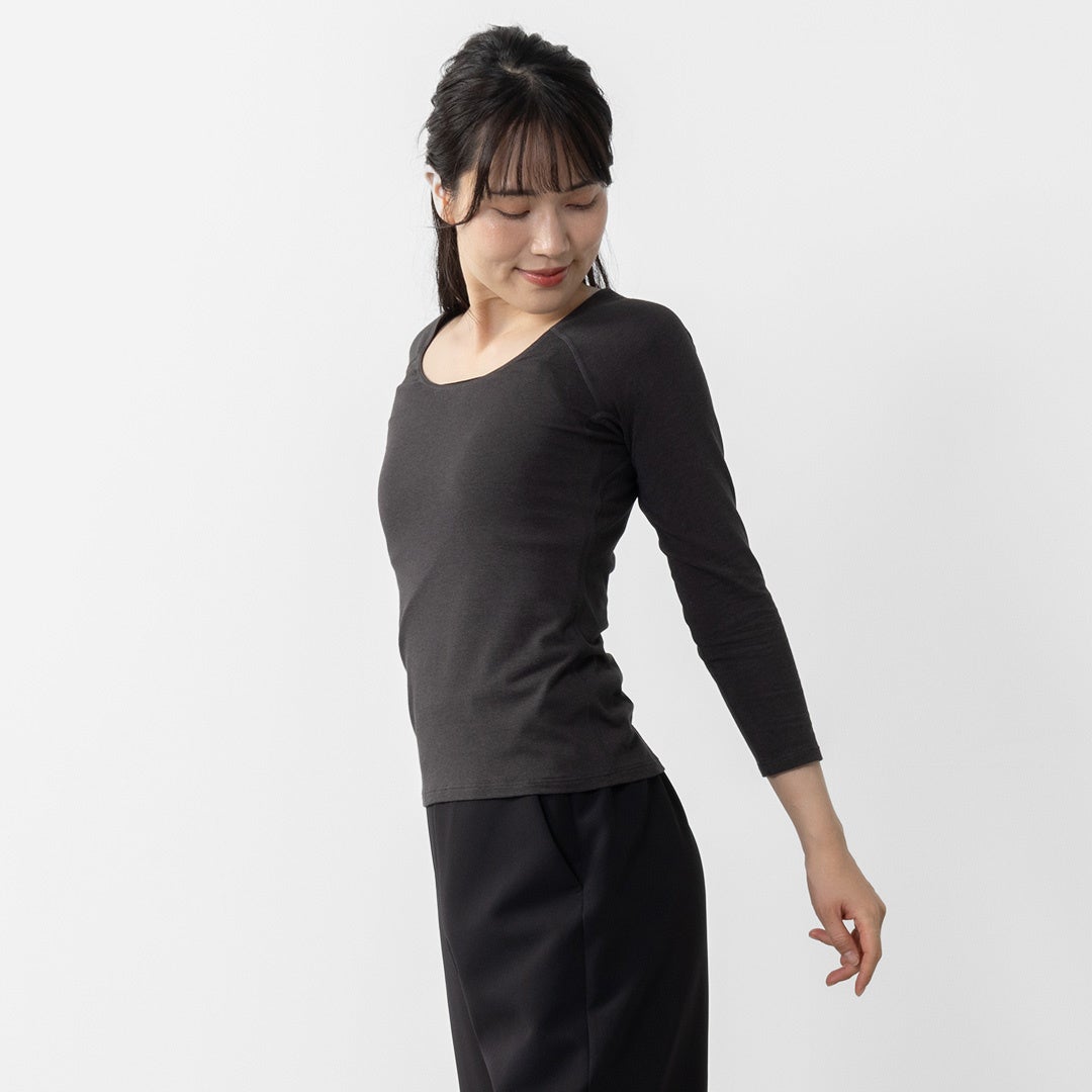 動きやすくてあたたかいインナー。活性海藻炭とレーヨン混紡糸で、温かさと快適な着心地を両立。オリジナル設計で肩や腕が動かしやすく、重ね着してもゴワつかずスッキリ着用できます。