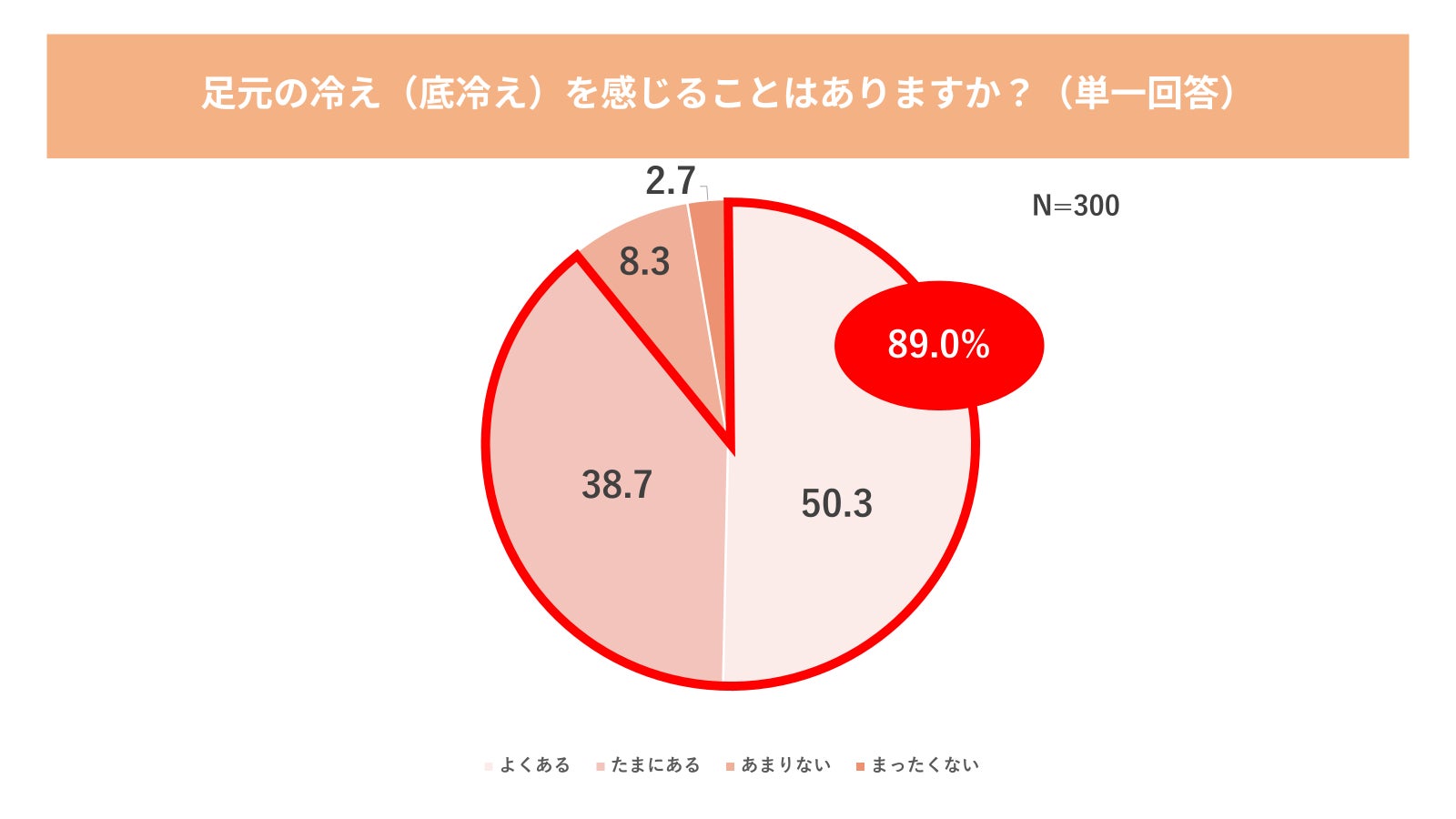 足元の冷え(底冷え)を感じることがあるか聞いたところ、89%の人が「ある」と回答。また、足元の冷えによって感じる不調としては、寒暖差による不調と同様「手足の冷え」が72.3%と最も多く、多くの女性に共通した問題であることが分かります。