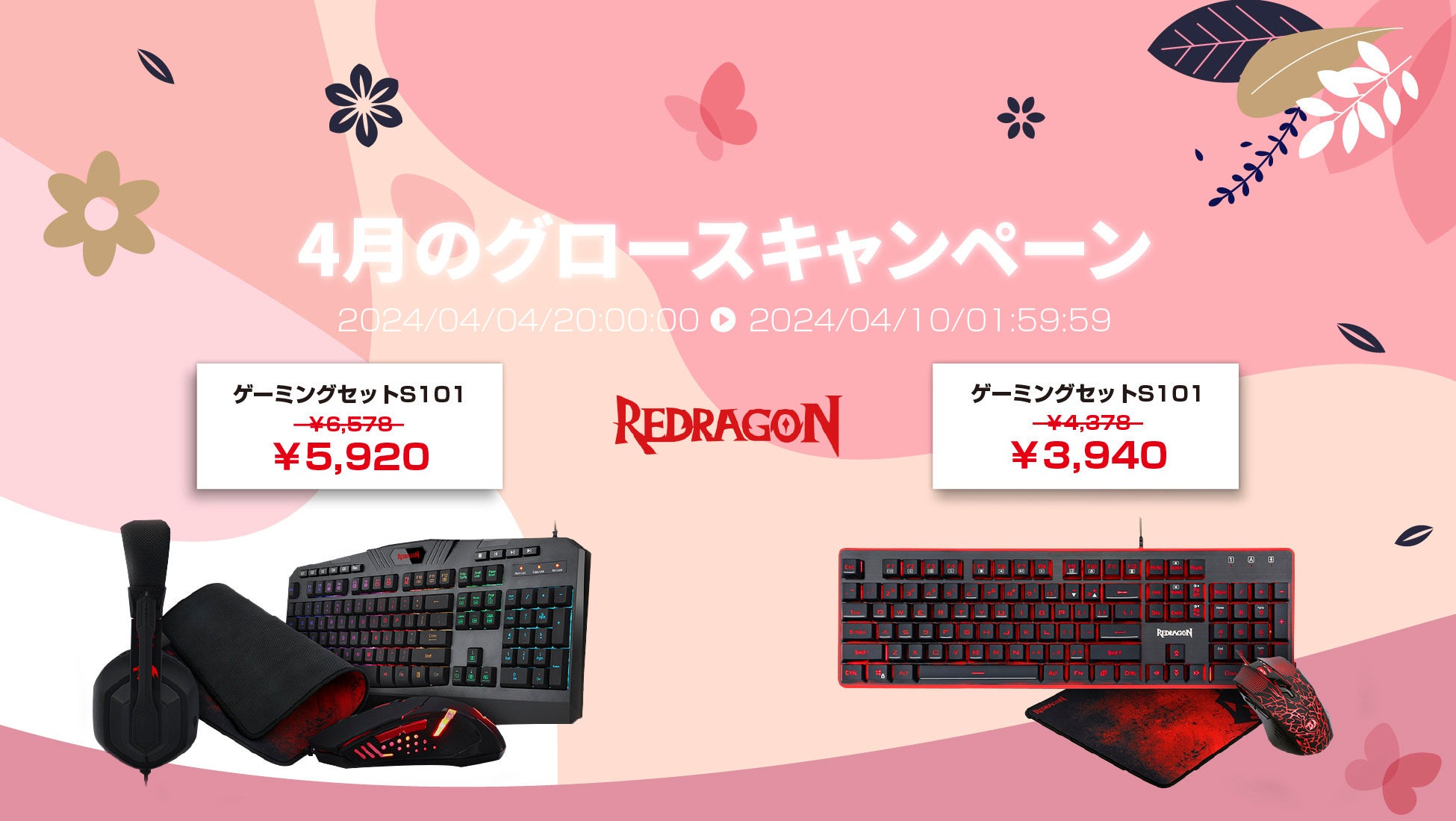 楽天「Show !t」は4月4日20時開始のお買い物マラソンに参加しポイント10倍プレゼント。REDRAGONのマウスやマウスパッド、ヘッドセット、キーボードなど、スターターセットをセール価格で販売。